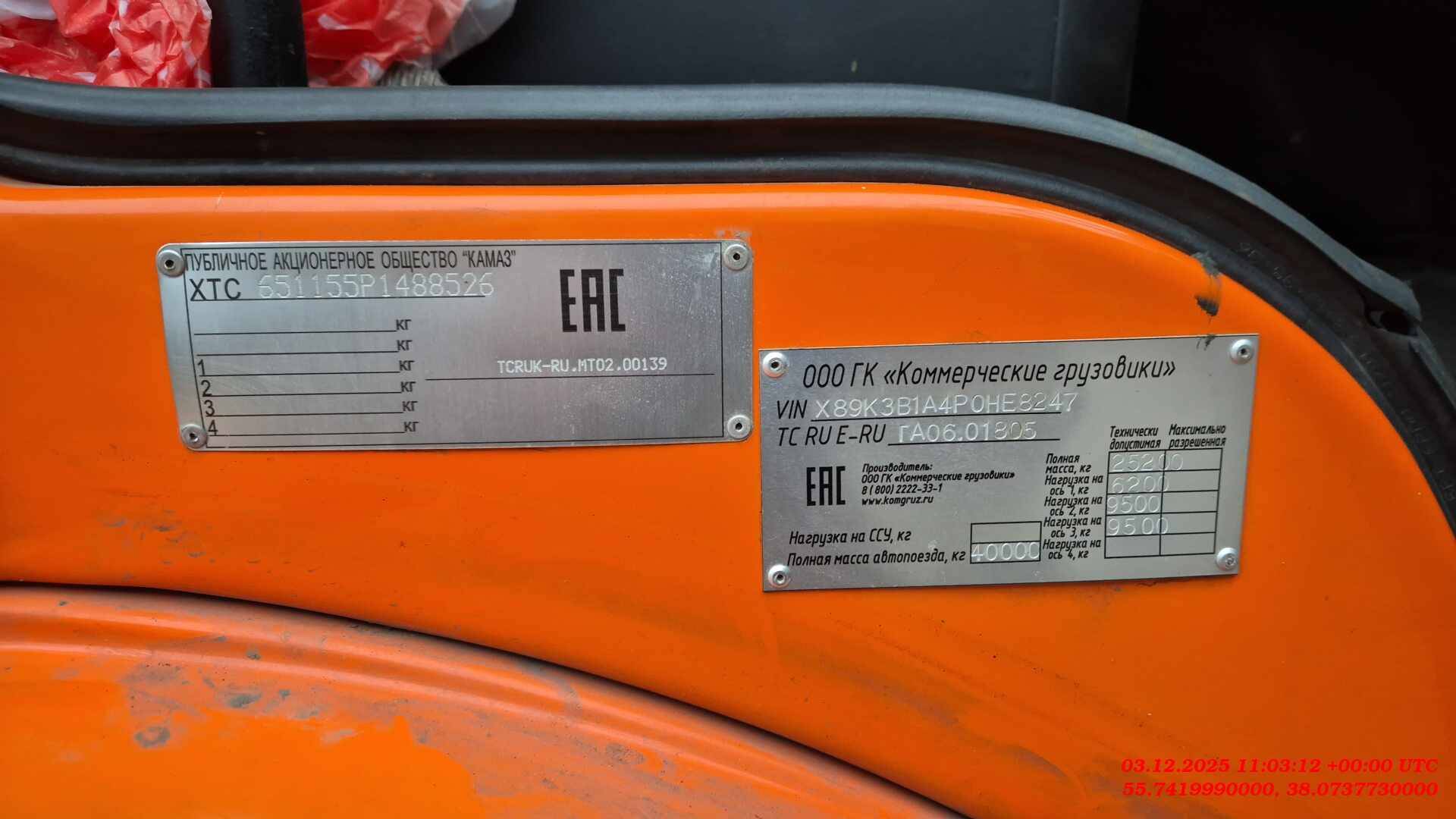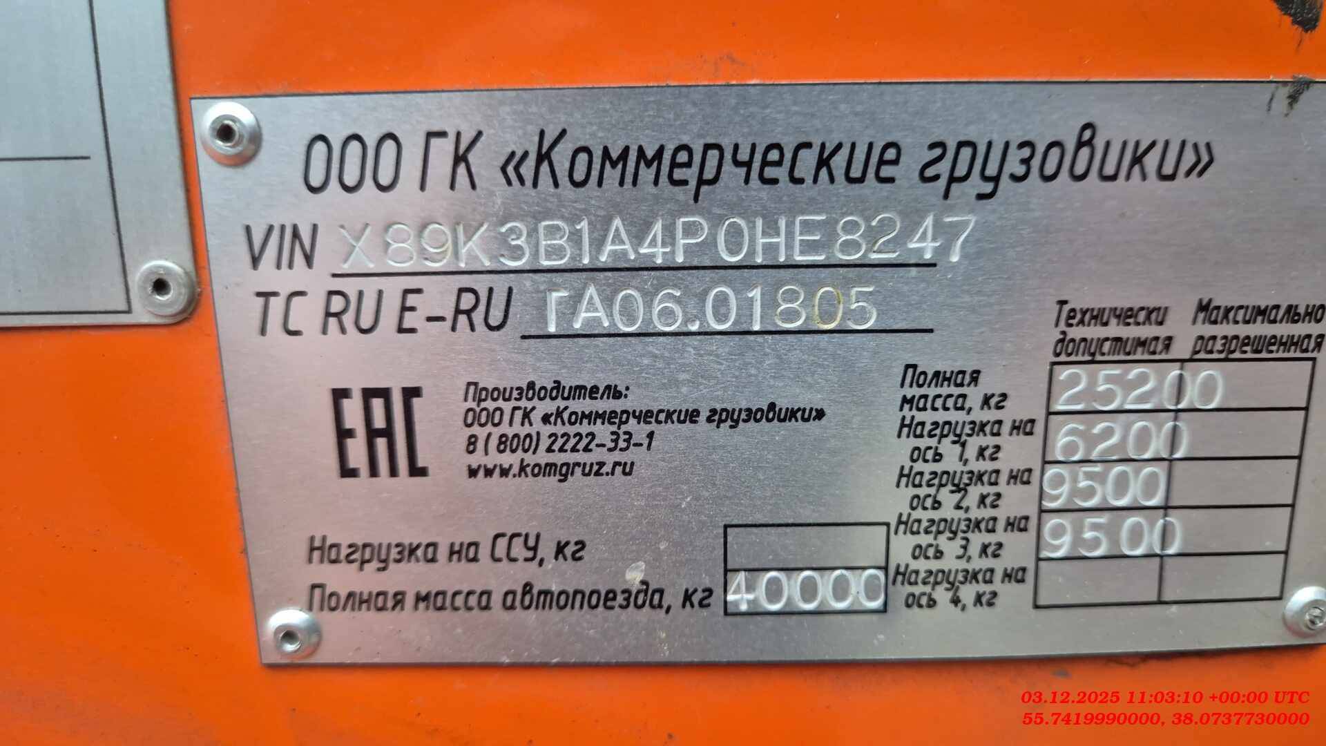 Технически допустимая максимальная масса транспортного средства, кг 25200